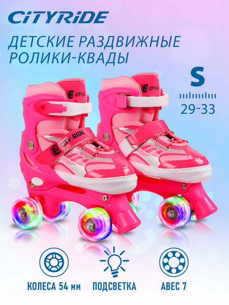 Роликовые коньки (Квады) "CITY-RIDE" - яркий и безопасный спортивный инвентарь для активного отдыха. Стильный дизайн и регулировка размера обеспечат удовольствие от каждой поездки. Передний тормоз. Все колеса светятся. Коньки раздвижные (до 5 размеров) Размер ботинка: S (29-33) Мягкий сапожок для комфортного катания Материал рамы: композитные материалы (металл, пластик) Тип подшипников: ABEC 7 Диаметр колеса: 54 мм Наличие тормоза: да Колеса: ПВХ Жесткость колеса: 76-80 А Тип фиксации: шнуровка, верхняя застежка (бакля), липучка Цвет: розовый Максимальный вес пользователя: 60 кг Размер упаковки: 12х38х27 см Вес упаковки: 2220 г Страна производства: Китай Страна бренда: Россия