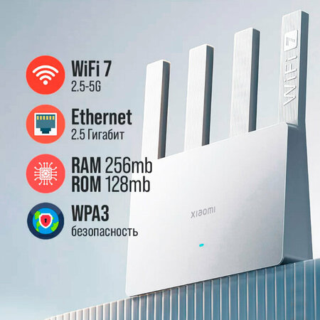 Wi-Fi роутер Xiaomi Router BE3600 WiFi 7 — работает в двух диапазонах 2,4 ГГц + 5 ГГц с суммарной скоростью до 3570 Мбитс/с. Эта версия имеет 4 адаптивных гигабитных WAN/LAN порта.