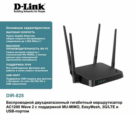 Роутер WiFi, D-Link DIR-825/RU/I1, беспроводной двухдиапазонный гигабитный маршрутизатор AC1200 Wave 2 с поддержкой VPN и MU-MIMO, 3G/LTE и USB-портом черный