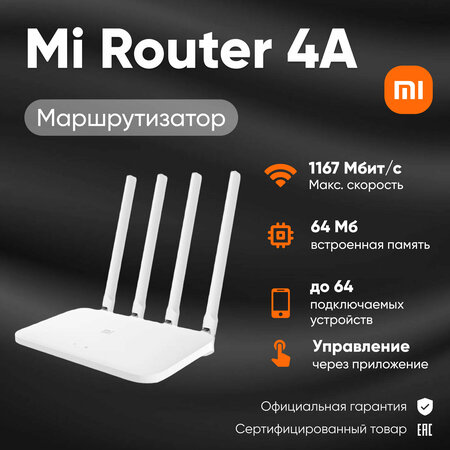 Роутер Xiaomi Mi Router 4A - это современное устройство, которое обеспечивает стабильное и быстрое подключение к интернету. Продукт от известного бренда Xiaomi, который зарекомендовал себя на рынке как производитель качественной и надежной техники. Одной из ключевых особенностей роутера является его высокая скорость передачи данных. В диапазоне 2,4 ГГц скорость составляет 300 Мбит/с, в диапазоне 5 ГГц — 867 Мбит/с, а максимальная скорость беспроводной связи достигает 1167 Мбит/с. Это позволяет пользователям наслаждаться быстрым и стабильным интернетом для работы, учебы и развлечений. Устройство поддерживает работу в двух диапазонах частот: 2,4 ГГц и 5 ГГц. Это позволяет выбрать оптимальный диапазон в зависимости от потребностей пользователя. Роутер оснащен четырьмя внешними всенаправленными антеннами, которые обеспечивают стабильное и быстрое соединение даже в сложных условиях. Объем памяти роутера составляет 64 МБ, что гарантирует стабильную передачу данных и надежное подключение каждого устройства. Управление временем, которое ваша семья проводит в интернете, становится еще более эффективным с функцией интеллектуального ограничения скорости. Она позволяет ограничить скорость каждого устройства доступа, чтобы избежать перегрузки сети. Приложение Mi WiFi содержит множество практичных функций, таких как оптимизация Wi-Fi и предотвращение несанкционированного доступа. Оно упрощает работу с маршрутизатором и устройствами доступа, позволяя удаленно управлять ими в любое время и в любом месте. В комплекте с роутером идут адаптер питания и инструкция на русском языке для подключения.