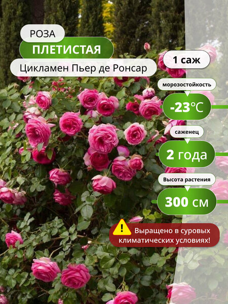 Роза плетистая "Cyclamen Pierre de Ronsard", Цикламен Пьер де Ронсар - является более красочной версией самой известной плетистой розы – Пьер де Ронсар. Цветки темно – розовые с серебристым реверсом, махровые от 70 до 80 лепестков. Аромат средней интенсивности. Цветение в небольших соцветиях в течение сезона. Темно – розовые с серебристым реверсом махровые цветки собраны в небольшие соцветия. Листва блестящая, зеленая. Отличная устойчивость к заболеваниям, цветение до заморозков. Посадка и уход Для успешного роста рекомендуется выбирать участок в южной части сада, где много солнечного света и тепла, а также есть защита от сквозняков и сильных порывов ветра. Роза предпочитает легкие, рыхлые почвы, обогащенные органическими компонентами, которые хорошо дышат и пропускают влагу. Важно, чтобы грунт не был кислым или заболоченным. Не стоит высаживать растению в низинах, где может скапливаться тающий снег, а грунтовые воды должны находиться на глубине 1,5 – 2 метра. Полив необходимо осуществлять медленно, под корень. Для того чтобы куст хорошо рос и обильно цвел, важно вовремя вносить удобрения: весной – азотные, а осенью – калийно – фосфорные смеси.