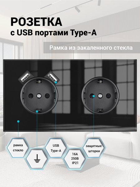 Установка двойной розетки В ДВА подрозетника. Розетка двойная в сборе с рамкой из закаленного стекла EU Socket with USB ( type-A) с выходами, с заземлением, предназначена для сетей 250 В, ток до 16A, USB:5V 2100mA. для питания и зарядки электронных устройств, это новая версия электрической розетки с USB - Type-A выходами без светодиода, не шумит(не пищит), подходит в стандартный круглый подрозетник 65-70мм. Розетка имеет защитные шторки, что предотвращает проникновение посторонних предметов, работа шторок "мягкая" и незаметная, вилка вставляется без затруднений. Установка осуществляется в стандартную круглую монтажную коробку для скрытого монтажа диаметром 65-68 мм, с межцентровым расстоянием для крепежных винтов 60 мм. В монтажные коробки 60 мм, а так же железные старого образца данная розетка не подходит, крепление осуществляется к монтажной коробке винтами из комплекта. Общие характеристики. Механизм розетки 60 мм, для рамок из стекла 82 типа. Материал: Термопластик/Закаленное стекло 4mm. Ток: 16А (розетка). 2.1A (двойные usb-порты) с двумя разъемами USB мощностью 5W. Рабочее напряжение (Розетка): 250 В. Рабочее напряжение (USB) : 5 В. Крепление: Винтовое (Механизм без распорных лапок). Размер: 153x82x35 мм. Монтаж в стандартный подрозетник 65-70 мм. Установочные коробки (подрозетники) не входят в комплект поставки.