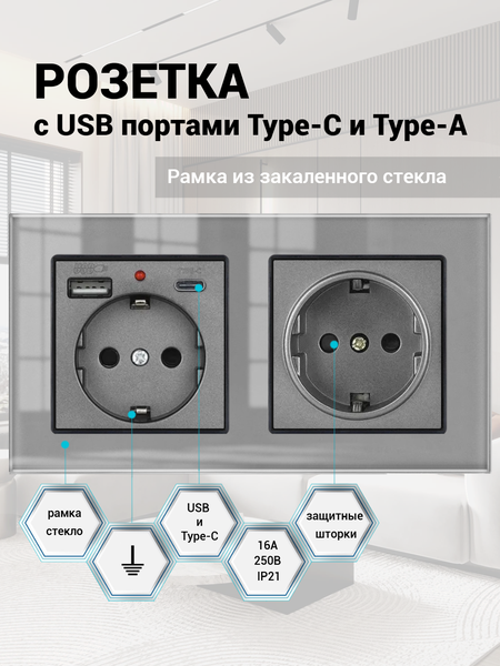 Установка двойной розетки в две монтажные коробки. Розетка электрическая двойная со стеклянной рамкой EU Socket with USB/type-C с выходами, поддерживающая протоколы зарядки Apple для iPhone 15 и 16, Samsung и Android. Розетка двойная в сборе с стеклянной рамкой, с заземлением, предназначена для сетей 250 В, ток до 16 А 16A USB:5V 2100mA. для питания и зарядки электронных устройств, это новая версия электрической розетки с USB и Type-C выходами без светодиода, не шумит(не пищит), подходит в стандартный круглый подрозетник 65-70мм. Розетка имеет защитные шторки, что предотвращает проникновение посторонних предметов, работа шторок "мягкая" и незаметная, вилка вставляется без затруднений. Механизмы можно вынуть из рамки и поменять порядок как самих розеток и выключателей, так и изменить их на горизонтальное, либо вертикальное расположение. Установка осуществляется в стандартную круглую монтажную коробку для скрытого монтажа диаметром 65-68 мм, с межцентровым расстоянием для крепежных винтов 60 мм. В монтажные коробки 60 мм, а так же железные старого образца данная розетка не подходит, крепление осуществляется к монтажной коробке винтами из комплекта. Общие характеристики. Механизм розетки 60 мм, для рамок из стекла 82 типа. Материал: Термопластик/Закаленное стекло 4mm. Размер: 153x82x35 мм. Ток: 16А (розетка). 2.1A (двойные usb-порты) с двумя разъемами Type-C и USB-A мощностью 5W. Рабочее напряжение (Розетка): 250 В. Рабочее напряжение (USB) : 5 В. Крепление: Винтовое (Механизм без распорных лапок). Монтаж в стандартный подрозетник 65-70 мм. Установочные коробки (подрозетники) не входят в комплект поставки.