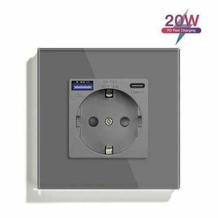 Розетка электрическая 1 пост с Usb/Type-C АC, быстрая зарядка 20W, цвет серый Розетка электрическая с заземлением 220 В 16A, с блоком питания 20W, это новая версия электрической розетки совмещенная с USB и Type-C выходами 5-12V 20W, подходит для быстрой зарядки смартфонов, планшетов и другой электроники. Защитные шторки предотвращают проникновение посторонних предметов, работа шторок "мягкая" и незаметная, вилка вставляется без затруднений. Установка осуществляется в стандартную круглую монтажную коробку для скрытого монтажа диаметром 65-68 мм, с межцентровым расстоянием для крепежных винтов 60 мм. В монтажные коробки 60 мм, а так же железные старого образца данная розетка не подходит, крепление осуществляется к монтажной коробке винтами из комплекта. Устанавливается в комплекте со стеклянной рамкой. Стеклянная рамка входит в комплект. Размер: 86x86x40 мм Быстрая зарядка Ток: 16А (розетка), 20W (двойные usb-порты) Материал: Термопластик/Закаленное стекло Рабочее напряжение (Розетка) : 250 В Рабочее напряжение (USB) : 5-12 В Монтаж в стандартный подрозетник 65-70 мм Комплектация: Розетка, рамка, крепеж, инструкция, упаковка