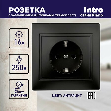 Розетка Intro Plano 1-206-05 с заземлением 2P+E Schuko со шторками 16А-250В IP20 скрытой установки черный