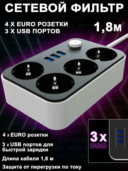 Сетевой фильтр с USB 4 розетки и 3 USB это мобильный вариант электророзетки с встроенной защитой от перегревания или короткого замыкания. Стабилизатор переходник обеспечивает постоянное напряжение электротока. Сетевой фильтр включает в себя 3 портf USB-A , 4 розетки под стандартные электрические вилки на 220 В, имеет привлекательный внешний вид и компактный корпус. Удлинитель силовой имеет пониженный нагрев, высокий уровень безопасности. Верхняя огнестойкость корпуса сетевого фильтра с предохранителем ПК и АБС. Интеллектуальная технология Super Charge TM быстрой зарядки через USB. Каждый порт зарядника может автоматически определять: мобильный телефон, планшет, компьютер, смартфон, наушники, ноутбук. Технические характеристики разветвителя: Ток: 10 А Входное напряжение: 100-250V Мощность удлинителя пилота: 2500 Вт. USB-порт: 3 шт Выход USB: 5 В, 4.1 А(Auto Max) Материал корпуса: пластик АВС. Пожаробезопасный корпус барьер блок. Количество розеток: 4 Длина провода: 1.8 м Цвет аксессуара: белый, черный. Сетевой фильтр с USB 4 розетки и 3 USB - С его помощью можно подключать не только электроприборы, но и одновременно заряжать до 3-[ устройств: смартфоны, планшеты, внешние батареи и многие другие устройства, которые поддерживают зарядку от USB-А порта. Фильтр защищает электронную технику от перегрузок по току, от короткого замыкания, а также импульсных помех благодаря автоматическому предохранителю, встроенному в выключателю.