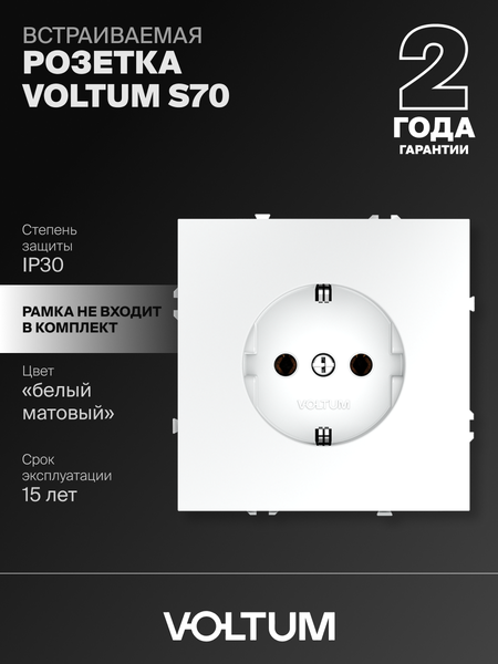 Розетка встраиваемая VOLTUM S70 с заземлением 16А Надежность и стиль в каждой детали Идеальное решение для дома и офиса Стильная белая глянцевая розетка с заземлением — это: ✔ Безопасность — прочный корпус из негорючего поликарбоната ✔ Надежность — 10 000 циклов подключения ✔ Удобство — самозажимные клеммы для быстрого монтажа ТОП-5 причин выбрать VOLTUM S70: ✅ Заземление — защита от поражения током ✅ Бронзовые контакты — стабильное соединение без перегрева ✅ Современный дизайн — глянцевая поверхность для любого интерьера ✅ Широкие монтажные возможности — подходит для проводов 0,75-2,5 мм² ✅ Долгий срок службы — гарантия 2 года Где особенно нужна? • В жилых комнатах и кухнях • В офисах и рабочих кабинетах • В детских (при использовании со специальными заглушками) Технические параметры: • Нагрузка: 16А / 230В • Размеры: 71×71×31,5 мм • Степень защиты: IP30 • Совместимость: со всеми рамками серии S70 В комплекте: механизм с накладкой (рамка приобретается отдельно) VOLTUM S70 — безопасное подключение ваших устройств! Надежное соединение — спокойствие в каждом контакте!