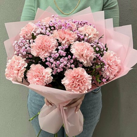 Букет из розовой гвоздики и гипсофилы — это необычный и стильный подарок, который создан для тех, кто любит неожиданности и хочет выделиться. Гипсофила символизирует невесомость и лёгкость, создавая атмосферу мечты и идеальности. Розовая гвоздика добавляет нотку романтики и любви. Яркая упаковка добавляет ещё больше стиля и индивидуальности к букету. Этот букет подходит для презентации в качестве подарка для любимой или для декорации интерьера, он может быть также хорошим выбором для специальных мероприятий, таких как выпускной вечер или день рождения.