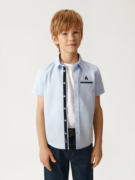 Детская рубашка с коротким рукавом для мальчика изготовлена из смесовой ткани декоративного переплетения. Сорочка прямого силуэта со стандартной линией плеч обещает классическую посадку по фигуре. Спереди расположен акцентный карман с контрастной обтачкой и декоративная вышивка с логотипом любимого бренда. Центральная застежка на петли и пуговицы делает процесс одевания легким и быстрым. Классический рубашечный воротник придает модели завершенный строгий вид. Голубая рубашка для мальчика станет базой детского гардероба, легко сочетаясь в образах для школы или повседневного ношения с джинсами или брюками.