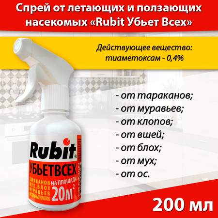 Инсектицидное средство "Рубит спрей Убьет всех" водный раствор, готовый к применению, предназначен для уничтожения летающих насекомых (мухи) и нелетающих (тараканы, постельные клопы, блохи, муравьи) в помещениях различного назначения: