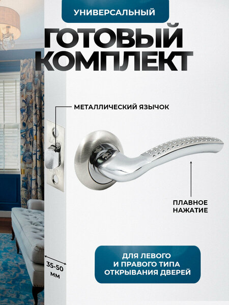 Комплект дверных ручек Loid для деревянных межкомнатных и металлических входных дверей, толщина полотна при этом должна составлять от 35 до 50 мм. Дверные ручки в комплекте универсальные, подходят на левые и правые двери. Отличительные особенности дверной фурнитуры – износоустойчивое и прочное покрытие, надежный механизм, качественные материалы, уникальный дизайн, легкий монтаж. Изготовлена из сплавов ЦАМ (основание и декоративная часть розетки) и алюминия (сплав силумина и кремния, из которого изготовлена сама ручка), и покрыта многослойным гальваническим покрытием (6 слоев). Это позволяет устанавливать данную модель как на межкомнатные, так и на входные двери, в том числе металлические. Такое основание придает прочность и устойчивость к нагрузкам, а также защищено от коррозии. Пружинный механизм выполнен из закаленной стали в 3 витка, ресурс работы рассчитан на не менее 400 000 рабочих циклов. Стяжки для установки - в комплекте. Гарантия на продукцию - 1 год. Раздельная дверная межкомнатная врезная ручка на розетке — это нажимная ручка на круглом или квадратном основании. Такие ручки часто используются на деревянных межкомнатных (спальни, офисы и другие помещения) и сантехнических дверях (в ванную комнату и туалет). Межкомнатные дверные ручки на раздельном основании подходят для основного большинства типов межкомнатных (немагнитных и магнитных) замков и дверных защелок с отверстием 8х8 мм под квадратный стержень. Защелка дверная врезная межкомнатная Loid предназначена для установки на деревянные межкомнатные двери. Защелка универсальная, может устанавливаться на левые и правые двери. Защелка межкомнатная легко устанавливается, стандартное отверстие под квадрат 8х8 мм позволяет комплектовать врезную защелку с любой раздельной ручкой на розетке. Межосевое расстояние стандартное 45 мм. Защелка для двери оснащена механизмом с прочным и надежным стальным ригелем. Корпус межкомнатной защелки изготовлен из прочной стали. Ответная и лицевая планка дверной защелки изготовлена из сплава ЦАМ и имеет пятислойное гальваническое покрытие, которое защищает изделие от коррозии и делает поверхность защелки для двери устойчивой к царапинам и истиранию. Дверная врезная защелка Loid имеет ресурс работы более 500 000 циклов открываний/закрываний.