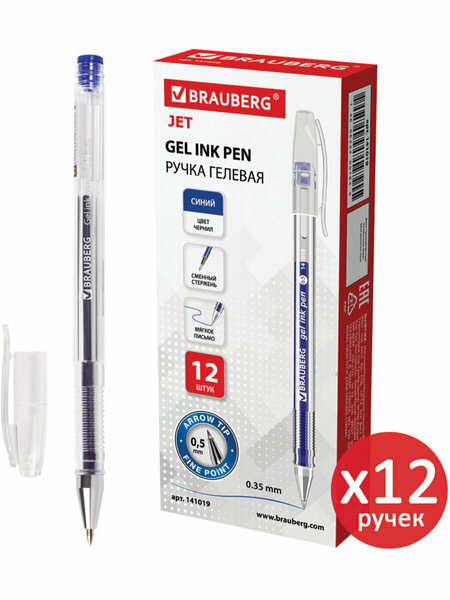 Ручка гелевая BRAUBERG Jet, комплект 12 штук, синяя, узел 0,5 мм, линия письма 0,35 мм, 880207