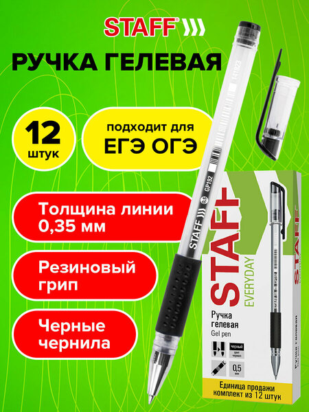 Ручка гелевая с грипом Staff Everyday Gp-192, Комплект 12 штук, Черная, узел 0,5 мм, линия письма 0,35 мм, 880216