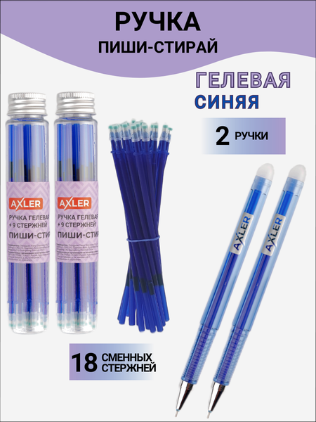 Ручка пиши стирай AXLER с ластиком, гелевая шариковая синяя, в наборе 2 шт. и 18 стержней со стираемыми чернилами