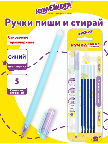 Ручка стираемая гелевая юнландия "Лимонад" - идеальное решение для тех, кто ценит милая канцелярия и функциональность. Эта ручка с удобным прорезиненным корпусом предлагает уникальную возможность многократного стирания и повторного письма благодаря специальным гелевым чернилам, которые становятся невидимыми при нагревании. Встроенный ластик позволяет легко стирать записи без следов, что делает ее незаменимой для школьников и студентов. Диаметр пишущего узла 0,5 мм создает аккуратную линию письма толщиной 0,35 мм, обеспечивая чистоту и четкость текста. В набор входит ручка и 5 сменных стержней, что обеспечит длительное использование. Эта ручка пиши стирай становится великолепным подарком для школы и подходит для тех, кто ценит канцелярия высокого качества. Ручка пиши стирай юнландия "Лимонад" – это не только полезный инструмент, но и стильный аксессуар, который подчеркнет вашу уникальность в мире милая канцелярия. • Цвет чернил: синий. • Количество в комплекте: 6 шт. • Толщина линии письма: 0.35 мм. • Форма наконечника: стандартный. • Серия: Лимонад. • Тип ручки: гелевая. • Стираемые чернила: да. • Диаметр пишущего узла: 0.5 мм. • Стирание чернил: стирательной резинкой. • Длина сменного стержня: 130 мм. • Комплектация: с запасными стержнями. • Цвет корпуса: ассорти. • Форма корпуса: круглая. • Покрытие корпуса: Soft touch. • Упаковка: блистер с европодвесом. • Артикул производителя: 144241.