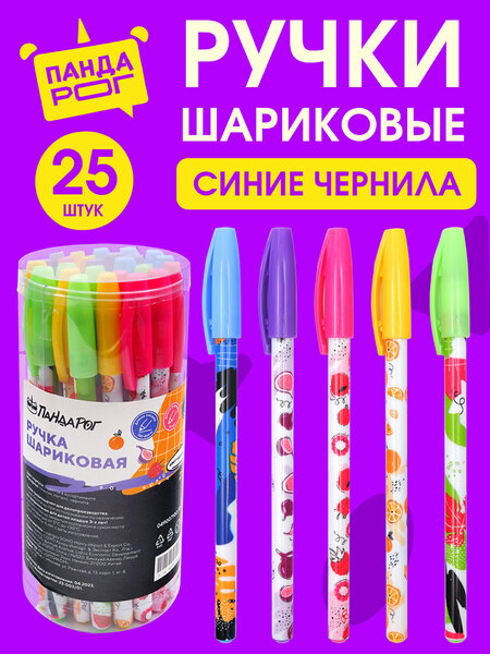 Ручка шариковая с масляными чернилами синего цвета – это идеальный пишущий инструмент для школьников и студентов. Она имеет модный яркий дизайн Фрукты, повышающий настроение и формирующий позитивный настрой при письме. Пулевидный металлический пишущий узел 0,7мм обеспечивает супер тонкое и гладкое письмо, а мягкие чернила на масляной основе – легкое скольжение. Ручка оставляет гладкий, однородный след и не требует усилий при письме. Заправки чернил в стержне хватает на линию длинной 700-800 м. Стержень - сменный. Ручки продаются набором по 25 шт в пластиковой тубе.
