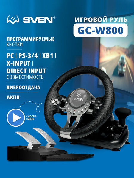 Разработчики игрового руля SVEN GC-W800 предусмотрели все нюансы для того, чтобы эффект участия в гонках был максимально реалистичным. Руль с педалями и рычагом переключения передач совместим с ОС Windows, PS3, PS4 и XB1 S/X. Общий угол поворота руля для игр – 180 градусов, по 90 градусов в каждую сторону. Виброотдача, которой оснащена игровая приставка, делает отзывчивость устройства просто невообразимой. Вы прочувствуете мельчайшие неровности дорожного покрытия, крутые повороты, резкие заносы и виражи. А больший эффект реальности создают педали и автоматическая коробка передач. Для устойчивости на гладких и ковровых покрытиях, педали оснащены резиновыми ножками. Для крепления на поверхности стола симулятор вождения оснащен скобой и присосками, которые находятся на нижней части блока руля. Рулевое колесо оснащено резиновыми вставками и пластиковыми наплывами, благодаря которым контакт с манипулятором во время вождения будет надёжным и не подведёт даже в самой накалённой ситуации. У игрового аксессуара предусмотрена возможность регулировки уровня вибрации, чувствительности руля и педалей: в комплекте поставляется CD-диск с необходимыми драйверами. В вашем распоряжении 12 функциональных клавиш, каждую из которых можно настроить на решение той или иной задачи. Руль оснащен двумя осями и 8-позиционным джойстиком, а также рычагом переключения передач «Tiptronic». Диаметр рулевого колеса - 10" (254 мм). Угол поворота руля - 180 градусов. Подключение с помощью USB-разъема. SVEN GC-W800 - находка для геймера!