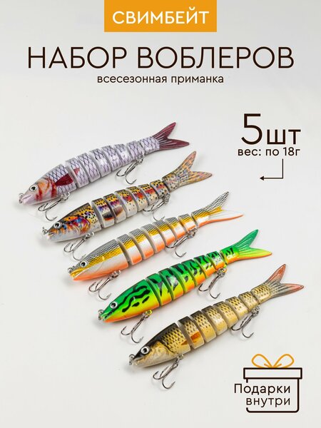 Рыболовный набор приманок с большими воблерами - необходимый инвентарь в арсенале каждого рыбака, который отправляется на ловлю хищной рыбы. С такими приманками вы сможете обеспечить себе отличный улов - будьте уверены, успех будет вам гарантирован! Комплект состоит из пяти готовых приманок свимбейт. Они выполнены из прочного и износостойкого пластика: благодаря этому изделия рассчитаны на многоразовое использование и не боятся повреждений. Их яркая расцветка привлекает хищников: окуня, щуку и жереха, судака (берша) и судака, а вытянутая продолговатая форма делает колеблющийся виб очень похожим на настоящую рыбку. Два тройных крючка повышают вероятность успеха ловли. Набор для рыболовства подходит как для летней, так и для зимней рыбалки - он станет замечательным дополнением к вашим наживкам и подойдет для спиннинга, твичинга и троллинга, кастинга и айс джигинга. Все принадлежности идут в пластиковом кейсе: благодаря этому можно безопасно хранить и транспортировать снасти. Вместе с воблерами в комплекте идут 3 поводка для предотвращения обрыва лески. Такой бокс станет лучшим подарком для мужчин рыбаков - подарите себе и своим близким комфорт и удачу на рыбалке!