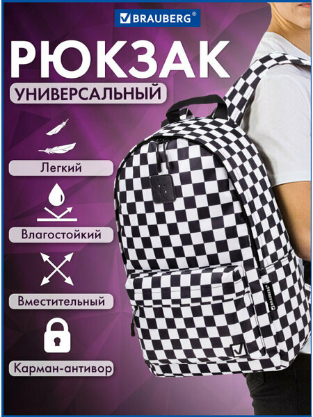 Рюкзак BRAUBERG POSITIVE универсальный Black and White – идеальный аксессуар для всех случаев жизни. Этот рюкзак отличается продуманным и стильным дизайном, что делает его отличным выбором для молодежи и взрослых. Благодаря боковым карманам и карману антивор, рюкзак обеспечивает максимальную удобство и безопасность. Рюкзак женский и рюкзак мужской отлично подойдут для учебы, прогулок и путешествий. Это идеальный рюкзак школьный для девочки и мальчика, стильный портфель для работы. Современный принт в виде черно-белой клетки делает рюкзак универсальным и легко сочетающимся с любым стилем одежды. Изготовленный из водоотталкивающего полиэстера-твилл, рюкзак гарантирует долговечность и износостойкость. Уплотненная спинка, дно и лямки способствуют комфортной носке, а удобные боковые карманы позволяют разместить бутылочки с водой, зонты и другие мелочи. Удобная регулировка длины лямок и реверсивная молния делают рюкзак особенно удобным в использовании. Прочная ручка-петля позволяет легко переносить сумку и подвешивать ее на крючок. Этот рюкзак – отличный подарок мужчине, женщине, школьнику. Выбирайте рюкзак BRAUBERG POSITIVE для максимального комфорта и стиля каждый день. • Пол: унисекс. • Серия: POSITIVE. • Объем: 16 л. • Количество отделений: 1. • Регулируемые лямки: да. • Количество карманов: 5. • Фронтальный карман: да. • Боковые карманы: да. • Наличие ручки для переноса: да. • Материал: полиэстер. • Цвет: белый/черный. • Дизайн: Black and White. • Высота: 42 см. • Ширина: 28 см. • Глубина: 14 см. • Вес: 0.4 кг. • Артикул производителя: 270777.
