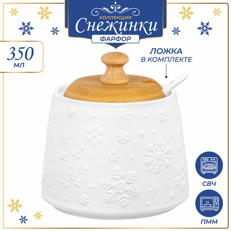 Сахарница серии "Снежинки" на 350 мл с крышкой и ложкой подойдет для хранения и красивой подачи к столу сахара, варенья, меда, соли, специй, кофе и других продуктов. Баночка выполнена из высококачественного белого фарфора и украшена рельефными узорами. Фарфоровая посуда отличается от керамики повышенной плотностью. Фарфор не впитывает цвет продуктов и не деформируется от влаги, чему может быть подвержена керамическая посуда. Размер емкости 9х9х10,5 см. Банку без крышки можно использовать в СВЧ (микроволновая печь) и ПММ (посудомоечная машина). Крышку из бамбука нельзя замачивать. Набор поставляется в стильной картонной упаковке. Сахарница из серии посуды "Снежинки" сможет стать настоящим украшением вашей кухни и сервировки или приятным подарком для ваших родных и близких!
