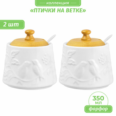 Набор 2-х сахарниц из серии «Птички на ветке» объемом 350 мл с деревянными крышками и фарфоровыми ложками выполнены из высококачественного фарфора и натурального бамбука. Теплое цветовое решение, изящный рельефный рисунок на фарфоре и удобство использования делают эти сахарницы желанным подарком любой хозяйке. У сахарниц широкое горло, которое удобно мыть, а бамбуковые крышки не позволят сахару намокнуть. В серии фарфоровой посуды с использованием бамбука представлен широкий ассортимент товаров для сервировки стола, которые несомненно впишутся в любой интерьер благодаря лаконичному дизайну, натуральным материалам и высокой функциональности. Такому подарку будет рада любая хозяйка!