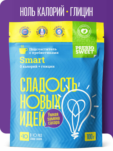 Кбжу: 0/10/0/0. Заменяет 1 кг сахара. Сахарозаменитель Пребиосвит Смарт с глицином. В 10 раз слаще сахара. Больше сладости, минимум калорий - максимум пользы здоровью. Антистресс: в составе содержится глицин - аминокислота, которая снижает психоэмоциональное напряжение, помогает бороться со стрессом при голодании и отказе от сахара и вредной еды. Лактулоза известна во всем мире как пребиотик для кишечника №1, который наилучшим образом стимулирует рост и жизнедеятельность полезной микрофлоры кишечника. Сукралоза рекомендована Всемирной организацией здравоохранения как безопасный заменитель сахарозы. Незаменим при безуглеводной диете для похудения и пп, на диабетическом здоровом питании и косметическом голодании, правильном диетическом питании для спортсменов. Альтернатива сахару при сахарном диабете. Существуют различные виды: сахзам в таблетках и саше, стевия порошок, аллюлоза, жидкий. Но признано, что самым безопасным для здоровья является натуральный эритритол или как его еще называют дынный сахар эритрол. Не имеет горечи как стевиозид. Продукт для диабетиков не просто относится к категории низкокалорийные продукты, а содержит 0 калорий. Используется как сахарозаменитель для выпечки, подсластитель для напитков и десертов, добавки в кофе и чай. 1 мерная ложка (1 г) заменяет 10 г (2 чайные ложки) сахара. Сахзам Prebiosweet Smart содержит подсластители эритрит и сукралозу, глицин и пребиотик лактулозу. No sugar