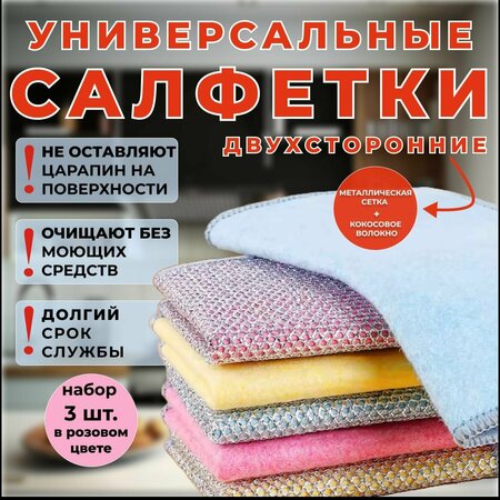 Представляем вам двухсторонние губки 2 в 1 в наборе 3 штуки, узелковая сетка + микрофибра - идеальное решение для дома, офиса или квартиры. Это не просто волшебная очищающая тканевая тряпка для уборки, это настоящая универсальная помощница в хозяйстве. С одной стороны губка скруббер - узелковая сетка, которая идеально подходит для мытья посуды, чистки кастрюль, сковородок, кухонного оборудования, а также для овощей и фруктов. Она эффективно справляется с жиром и загрязнениями, не царапая поверхности. С другой стороны - мягкая микрофибра, которая отлично подходит для протирки стекол и зеркал, труднодоступных мест: от мебели и холодильника до сантехники унитаза и ванной комнаты. Многоразовая хозяйственная микрофибру салфетка не просто убирает пыль и грязь, она впитывающая, а также с легкостью справляется с удалением пятен, разводов благодаря своей уникальной структуре. При этом безворсовая и не царапает поверхности, что делает её идеальной деликатных и глянцевых поверхностей. Более того, благодаря своей двухсторонней структуре, она также подходит для мытья посуды, раковины, плиты и других кухонных принадлежностей. Универсальные чистящие розовые салфетки можно использовать для очищения любых видов пола (линолеума, кафеля, ламината, паркета, ковролина и т. д.), стола, кухонных плиток. Их используют при бытовой и профессиональном клининг. Эта металлическая плотная протирочная тряпочка не только эффективно убирает грязь, но и обладает антибактериальными свойствами, предотвращая распространение бактерий. Кроме того, она пригодна для сухой и влажной уборки как с моющими средствами, так и без химии, что делает её ещё более универсальной. Используйте чудо комплект столовых тряпок для кухни, комнаты или любого другого места, где требуется чистота. Она станет незаменимой помощницей в вашем хозяйстве, делая уборку простой, быстрой и приятной