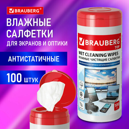 Салфетки для экранов всех типов и оптики Brauberg Топ, туба 100 шт, влажные, 513812
