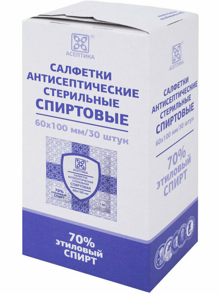 Спиртовые салфетки антисептические асептика - ваш надежный помощник для дезинфекции кожи и поверхностей. Каждая салфетка размером 60х100 мм пропитана 70% раствором этилового спирта высшей очистки, что обеспечивает мощную противомикробную активность. Идеально подходят для обработки инъекционного поля во время вакцинации и инъекций, а также для ухода за кожей рук. Эти антисептические салфетки отлично справляются с оболочечными вирусами и бактериями, не вызывая резистентности. Салфетки надежно защищают и дезинфицируют, их можно использовать для стерилизации маникюра или ухода за ногтями, ведь они безворсовые и не оставляют следов. Удобная упаковка в 30 штук позволит всегда иметь под рукой средство для санации, включая влажные салфетки для новорожденных. Храните их при температуре от -40°C до +40°C, и они сохранят свою эффективность до 5 лет. Используйте спиртовые салфетки асептика для быстрой и надежной защиты в любой ситуации! • Назначение: для антисептической обработки рук, для обеззараживания инструментов, для обеззараживания поверхностей, для/после инъекций. • Размер: 60х100 мм. • Количество в упаковке: 30 шт. • Вид пропитки: 70% этиловый спирт. • Материал: нетканый материал. • Упаковка: короб. • Артикул производителя: 630860.
