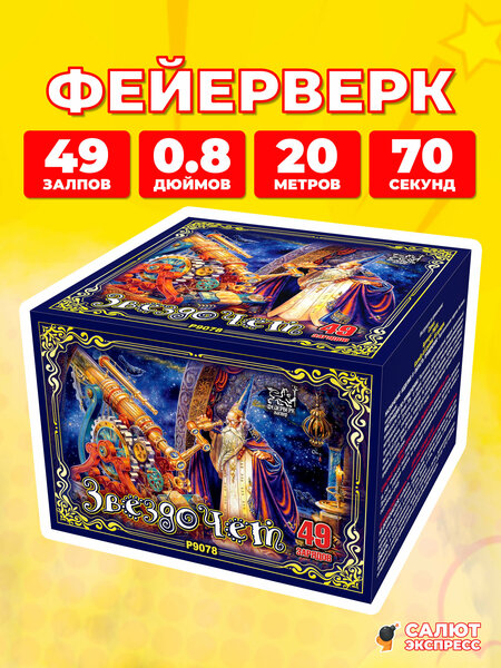 Салют «Звездочёт» на 49 залпов один из самых красочных фейерверков. Уникальность каждого заряда придает этому салюту дополнительную зрелищность и делает его поистине незабываемым. Салюты и фейерверки 49 залпов отлично подойдут на Новый год, день рождения, свадьбу, юбилей и другой праздник и сделает его незабываемым! Важно соблюдать технику безопасности при запуске фейерверков! Фейерверки и салюты храните в сухом месте, в оригинальной упаковке. Запрещено хранить пиротехнические изделия во влажном или в очень сухом помещении с высокой температурой воздуха (более 30°С), рядом с легковоспламеняющимися предметами и веществами, а так обогревательных приборов. Избегать прямого попадания солнечных лучей!