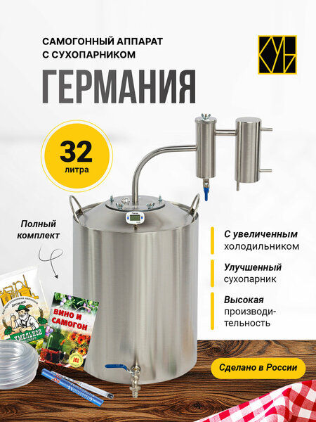 Самогонный аппарат Германия — классическая модель дистиллятора на конусном баке с сухопарником для качественной очистки перегоняемого продукта от сивушных масел. Объемный сухопарник гораздо лучше справляется с очисткой спиртовых паров. Секрет качественного напитка — очистка. Чтобы получить чистый и безопасный напиток, сливайте сивушные масла после каждого литра выгнанного напитка. Для этого в сухопарнике есть кран, который поможет слить сивушные масла и получить чистый продукт. Это значит, что после перегонки вам не потребуется дополнительно очищать напитки от вредных примесей. Напиток сразу получается чистым и без запахов Конусная конструкция бака способствует образованию тяги, благодаря чему спиртовые пары беспрепятственно проникают в трубку отбора продукта. Перегонный куб оборудован краником для слива барды, что позволяет сливать «хвосты», которые остаются на дне бака после отделения «голов» и «тел» спирта. Широкая горловина позволяет без труда заливать брагу в бак перед перегонкой, а также промывать его по окончании всего процесса. Теперь готовить напитки можно на любом источнике нагрева, даже на открытом костре. Благодаря современному ферромагнитному дну вы можете готовить вкусные дистилляты на любых типах плит: газовых, электрических, стеклокерамических и индукционных. Кроме спиртомера и книги рецептов мы дарим вам дополнительно упаковку дрожжей "Хмельной эксперт"