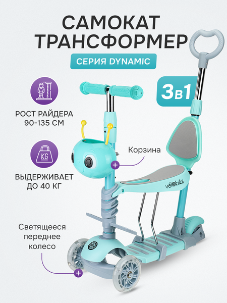Самокат трансформер серия "Dynamic" трехколесный, регулировка высоты руля, нагрузка до 40 кг, голубой