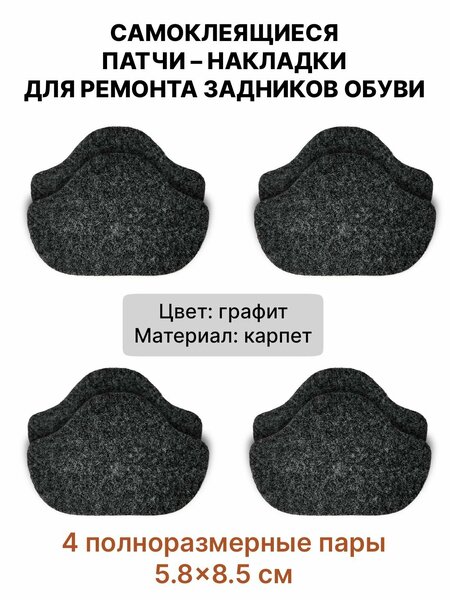 / Подпяточник для обуви 8 штук / Вкладыши от мозолей / Запяточник в туфли и кроссовки / Самоклеящиеся заплатки для ремонта обуви 8 штук. Комплект состоит из 8 заплаток с влагостойким клеевым слоем. Заплатки самоклеящиеся для ремонта задников обуви - крайне полезное приобретение. Многие сталкиваются с проблемой, когда запяточник обуви протирается, рвется, собираются катышки, что доставляет дискомфорт при ходьбе. Обувные пяткоудерживатели предохраняют пятки от натирания и появления натоптышей, мозолей. С их помощью вы сможете устранить дефекты задней части обуви, улучшить ее внешний вид и уменьшить трение пятки, тем самым избавляя от боли, натирания и мозолей. Напяточники просты в использовании, имеют улучшенную влагостойкую клеевую основу. Подходят для всех видов обуви: кроссовок, кед, туфель, ботинок, спортивной обуви и прочей. Их можно подогнать ножницами под любой размер. Также можно использовать как пяткоудерживатели для стабильной поддержки стопы во время ходьбы для предотвращения образования мозолей на пятке. Заплатки для ремонта изготовлены из нетканых материалов, либо экокожи. Они имеют хорошие износостойкие характеристики, влагоустойчивую клейкую основу, которая легко крепится к заднику обуви. Такие вставки прослужат дольше чем сама обувь и доставят комфорт при прогулках в любимой обуви. Этим аксессуаром легко и удобно пользоваться с целью ремонта задников обуви. На выбор имеются варианты из разных типов материалов разного цвета: