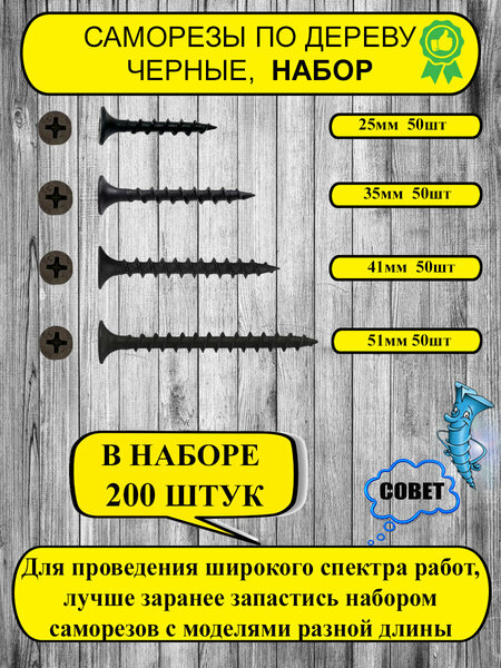 Саморезы по дереву усиленные, фосфатированные, Набор 25, 35, 41, 51мм по 50шт