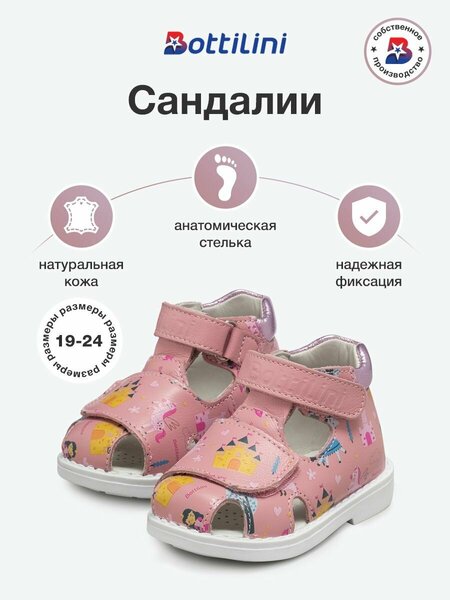 Длины стелек: 19р.-11,5 см, 20р.-12,5 см, 21р.-13 см, 22р.-13,5см, 23р.-14,5см, 24р.-15 см, 25р.-15,5 см, 26р.-16,5 см, 27р. -17 см, 28р.-17,5 см, 29р.-18,5 см, 30р.-19 см, 31р.-19,5 см, 32р.-20,5 см, 33р.-21 см, 34р.-21,5 см, 35р.-22,5 см. Стильные закрытые сандалии из натуральной кожи для девочки позволят избежать плоскостопия и обеспечат малышу комфорт. Модель на липучке подойдет на узкую и широкую ногу. Анатомическая обувь из натуральных материалов не давит и не натирает. В ней обеспечивается надежная фиксация пятки и маленькая ножка не подворачивается. Модные сандали на платформе с каблуком Томаса оснащены многослойной стелькой и супинатором. Они впишутся в спортивный и пляжный стиль, отлично подойдут для похода в детский сад, поездок на море, прогулок и незаменимы при проблемах с ортопедией. Мягкие сандалики с закрытой пяткой и носом созданы для маленьких детей и подростков. Выбирайте лучшее для Вашего ребёнка - выбирайте BOTTILINI