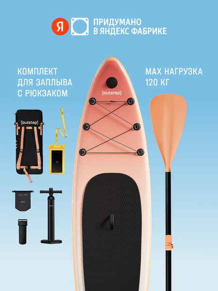 Outstep — это бренд для активного отдыха и безмятежных прогулок на природе, придуманный в Яндексе. Надувной сапборд Outstep 305 см создан как для неторопливых прогулок по спокойной воде, так и для подвижной гребли и каякинга. Сап выдерживает нагрузку до 120 кг. Доска устойчивая, с широкой нескользящей палубой. Обтекаемая форма, прочная конструкция и заострённый нос делают сап манёвренным и ловким. Обновленное нетонущее весло с усиленной фиксацией состоит из 3 секций - его можно разобрать и компактно сложить в рюкзак. Благодаря конструкции весло можно отрегулировать под нужный рост. Увеличенная карго-зона сапборда с 6 кольцами помогает равномерно распределить дополнительный груз: например, рюкзак или гермомешок с вещами и обувью. В комплекте — насос с манометром: пригодится для точной настройки давления при накачивании сапа. Кроме того, с его помощью можно быстро и без усилий сдуть надувную доску после прогулки. Готовый к заплыву сап удобно переносить за специальную ручку. Чтобы запечатлеть путешествие, на носу сапборда есть специальное крепление для экшн-камеры. Все аксессуары и сам сапборд помещаются во вместительный рюкзак — в нём удобно и переносить, и хранить весь комплект. Дополнительно — водонепроницаемый чехол для телефона 11х19 см, гермосумка на 5 литров. И ремкомплект на случай непредвиденных ситуаций.