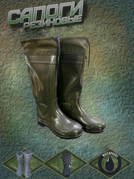 Изготавливается из высококачественной резины, что делает ее пластичнее и до 20%-30% легче аналогов, зимой не замерзают на морозе, надежная и качественная подошва, высота голенища 42 см