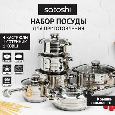 Набор посуды SATOSHI Рокруа - это высококачественная кухонная утварь, которая включает в себя 4 кастрюли, ковш и сковороду. Все изделия выполнены из нержавеющей стали, что обеспечивает их долговечность и надежность. Крышки из жаропрочного стекла позволяют наблюдать за процессом приготовления пищи, а пятислойное капсульное дно обеспечивает равномерное термораспределение. Особенностью набора является наличие мерной шкалы на каждой кастрюле, что позволяет точно измерять количество ингредиентов. Материал ручек из стали обеспечивает надежный захват и предотвращает нагревание. Набор посуды SATOSHI Рокруа подходит для использования на всех типах плит, включая индукционные. Это позволяет использовать его в различных условиях и на разных кухнях. В комплекте с посудой идут 5 крышек, которые обеспечивают герметичность и сохраняют аромат блюд. Вес набора составляет 7,24 кг, что делает его удобным для транспортировки и хранения. Выбирая набор посуды SATOSHI Рокруа, вы получаете высококачественную и функциональную кухонную утварь, которая станет незаменимым помощником на вашей кухне.
