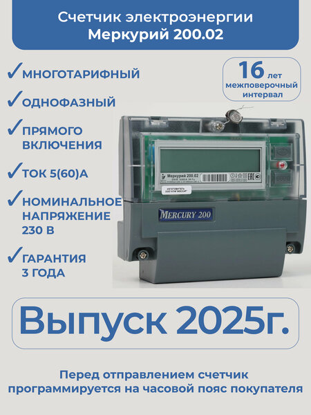 Меркурий 200.02 - предназначен для многотарифного учета активной электрической энергии и мощности, а также измерения параметров электрической сети в двухпроводных сетях переменного тока с последующим хранением накопленной информации, формированием событий и передачей информации в центры сбора данных систем аскуэ. Счетчик предназначен для эксплуатации внутри закрытых помещений и в местах, имеющих защиту от влияния окружающей среды (в шкафах, в щитках). Особенности: Программируется через CAN интерфейс (для этого можно использовать Меркурий 221)