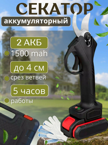 Аккумуляторные секаторные ножницы для резки и обрезки ветвей и сучьев. Для сада и огорода. Лезвие, изготовлено из вольфрамовой стали, долговечное. Аккумулятор: 21V 2000 мАч 2 шт Напряжение зарядки: 110-220 В Время зарядки: 1-1,5 h Время работы: 4-5 ч Мощность: 500 Вт Для включения однократно нажать кнопку (не держать долго), после 2 раза быстро нажать курок. В 8-10 раз эффективнее традиционного ручного секатора. Качество обрезки значительно выше по сравнению с ручным секатором. Комплектация: Электрический корпус ножниц Адаптер питания Аккумулятор 2 шт Шестигранный ключ Рукав Руководство пользователя Чемодан