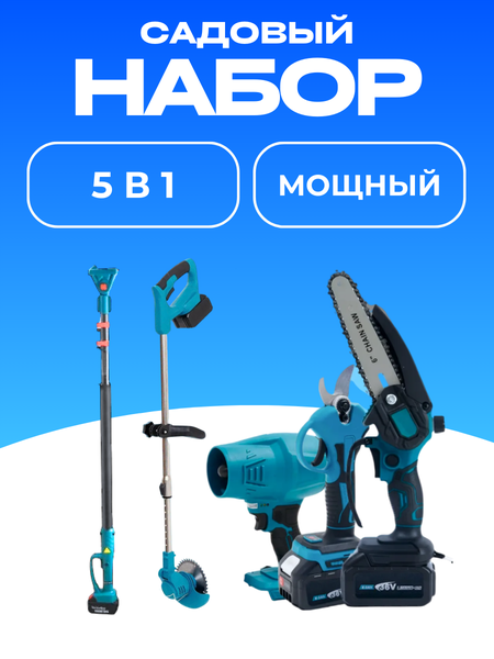 Секатор, мини пила и садовый триммер, воздуходув и удлинитель - набор для сада аккумуляторный 5 в 1