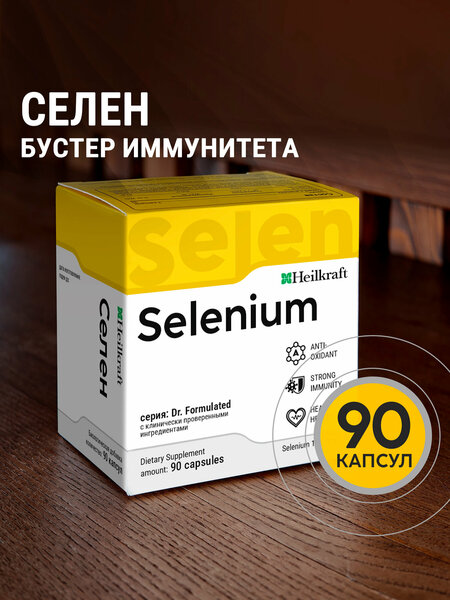 Селен относится к числу самых важных микроэлементов, необходимых для нормального функционирования органов человека. Этот элемент выполняет важную роль в обмене веществ, работе щитовидной железы, защите клеток от повреждений, связанных с окислительным стрессом. Селен также важен для укрепления иммунной системы, улучшения работы мозга и снижения риска сердечно-сосудистых заболеваний. Селен - самый известный и важный компонент антиоксидантной системы организма. Он входит в состав активного центра антиоксидантного фермента — глутатионпероксидазы, которая осуществляет защиту клеток от повреждающего действия перекисей и гидроперекисей липидов. Поэтому считается, что при достаточном поступлении селен защищает организм от онкологических заболеваний. - Селен предупреждает заболевания печени. Нормализует работу щитовидной железы. Снижает риск образования рака пищевода и желудка; - Влияет на выработку половых гормонов, устраняет приливы и недомогания во время климакса у женщин, поддерживает нормальную выработку и сохранность спермы у мужчин; - Селен эффективен при заболеваниях поджелудочной железы и инфаркте миокарда; - Поддерживает эластичность кожи, качество волос и ногтей, ускоряет заживление ран. Помогает в лечении и профилактике перхоти. Использование селена. Малые концентрации селена ускоряют рост, оказывают антидистрофический эффект и противоаллергическое действие за счет подавления гистамина, стимулируют пролиферацию различных тканей, улучшают функцию сердца, щитовидной железы, иммунной системы, половых желез. В оптимальных дозах способствуют быстрому восстановлению катастрофически пониженного артериального давления. Эффективное усвоение селена зависит от нескольких факторов. Основным из которых является форма селена. В основе БАД Селен от Heilkraft - Селенометионин. Эта форма селена считается наиболее биодоступной и хорошо усваиваемой организмом. Селенометионин легко превращается в селенопротеины, необходимые для различных функций в организме. Поддержать организм в сезон простуд и укрепить иммунитет после перенесенных нагрузок поможет БАД Селен от Heilkraft с оптимальной дозировкой 100мкг на порцию.