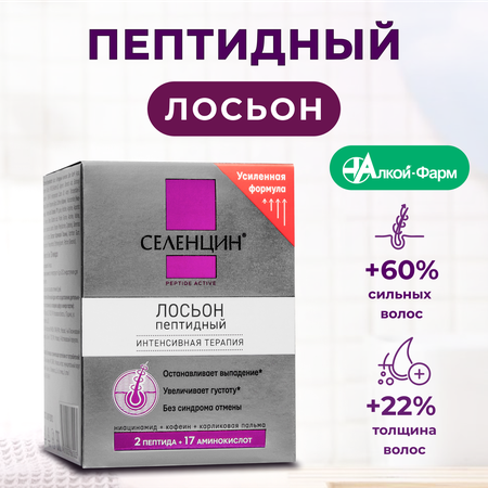 Пептидный комплекс: Capilectine™ SP / Procapil® Активизирует клеточный метаболизм в волосяных фолликулах, что способствует ускорению роста волос Стимулирует переход волосяных фолликулов в активную стадию роста Пролонгирует жизненный цикл волоса, способствуя повышению густоты волос Замедляет процесс старения волосяных фолликулов Экстракт листьев Гинкго-билоба обеспечивает Улучшение микроциркуляции на уровне волосяного фолликула Останавливает процессы старения на клеточном уровне Восстанавливает углеводный обмен на уровне волосяного фолликула Профессиональный комплекс дмаэ обладает Антиоксидантным, противовоспалительным свойствами Профилактирует старение клеток, Улучшает кислородный обмен, Повышает энергетический статус волосяного фолликула. Экстракт Карликовой пальмы Профилактирует и останавливает андроген-зависимое выпадение волос. Восстанавливает нормальную работу андроген-зависимых сигнальных путей, Профилактирует миниатюризацию волосяных фолликулов и восстанавливает толщину стержня волос Рекомендации по применению Перед применением взболтать содержимое ампулы и надломить носик ампулы по риске, повернув крышку ампулы до вскрытия. С помощью нажатия на ампулу выдавить лосьон на сухую кожу проблемной области волосистой части головы в прикорневую зону. Количество лосьона на 1 применение зависит от площади поверхности проблемной зоны. (В среднем используется -2,5мл. - половина ампулы. Риска на этикетке ампулы показывает объем дозы на 1 применение. 1 ампула содержит 5 мл - на 2 применения.) После нанесения лосьона помассировать голову легкими движениями. Не смывать! Курс применения составляет не менее 4-х месяцев. Применяется 1 раз в день утром или вечером. Для герметичного хранения и повторного использования ампула закрывается крышкой. Лосьон быстро впитывается и не оставляет следов. Обладает нейтральным ароматом. Описание Специализированный лосьон для восстановления густоты волос Селенцин Peptide Active «Save Your hair» основан на комплексе пептидов: Capilectine™ SP и PROCAPIL®, который известен в профессиональной косметологии компонента дмаэ и биоактивных компонентов экстрактов Карликовой пальмы и листьев Гинкго билобы, специально создан для предотвращения чрезмерного выпадения, активного роста и восстановления густоты волос. Показан при поредении и истончении волос, при андрогенном выпадении волос, при длительном диффузном выпадении волос. Пептидный лосьон для восстановления густоты волос Селенцин Peptide Active «Save Your hair» -Замедляет старение волосяного фолликула на 41%*, -Стимулирует рост волос эффективнее на 63 %*, чем стандартная терапия, -Восстанавливает густоту волос без синдрома отмены и без инъекций.*