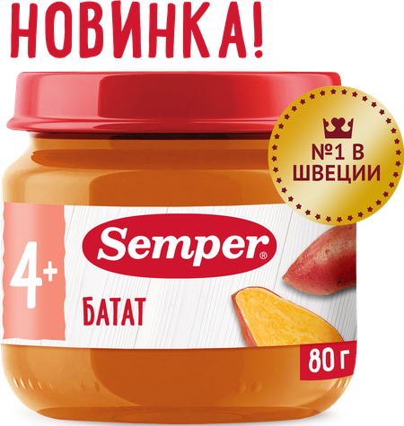 Semper - натуральное и премиальное детское питание №1 в Швеции. Мы придерживаемся шведских стандартов качества и философии экологичности, создавая вкусную еду для малышей. Батат — это полезный корнеплод родом из тропиков. Несмотря на то, что второе название батата - сладкий картофель, с привычным нам картофелем у батата не так много общего. В обычном картофеле больше крахмала и выше калорийность. Батат — это не только удивительно вкусный, но и очень полезный корнеплод. Он содержит большое количество сложных углеводов, клетчатки и витаминов (А, С, В6), но главной его особенностью является высокое содержание витамина А и бета-каротина. Эти вещества играют важную роль в организме человека, в частности, они необходимы для поддержания здоровья глаз и кожи. Батат может стать отличным выбором для первого прикорма. Нежный сладковатый вкус этого корнеплода обязательно понравится вашему малышу. Пюре из батата можно предложить малышу в качестве самостоятельного блюда или сочетать его с мясными пюре или кашами. Это позволит вам разнообразить рацион ребёнка и познакомить его с новыми вкусовыми сочетаниями.