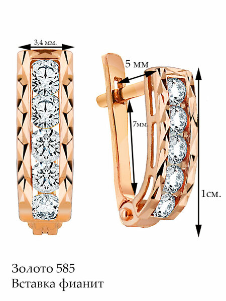 Детские серьги из красного золота 585 пробы с фианитами. Длина серьги 1 см. Длина штифта под мочку 5 мм. Длина рабочей зоны (под мочку) 7мм. Ширина лицевой части серьги 3,40 мм. Характеристика вставок: 10 Фианит-недрагоценная вставка круг 2,0. Значения параметров в характеристиках являются ориентировочными. Серьги дорожки золотые с алмазной гранью. На сережки нанесена алмазная грань - это техника нанесения геометрического рисунка алмазным резцом на поверхность ювелирного украшения, которая сверкает при любом освещении. Детские серьги дорожки с фианитами изготовлены из классического красного золота 585 пробы. Длина серьги 1 см. Длина штифта под мочку 5 мм. Длина рабочей зоны (под мочку) 7мм. Ширина лицевой части серьги 3,40 мм. Минимальный вес - 1г, средний вес - 1,10г. Английская застежка на сережках – одна из самых популярных на сегодня. Этот тип по праву считается одним из самых надежных. Характеристика вставок: 10 Фианит круг диаметр 2мм. Фианит - искусственный аналог бриллианта. Фианит по своему внешнему виду ничуть не уступает бриллианту, он идеально чист, прозрачен и играет на солнце как драгоценный камень. Украшения из красного золота смотрятся благородно и всегда обращают на себя внимание. Золотые детские серьги 585 пробы - идеальный подарок для девочки дочки племянницы внучки сестре на день рождения день Святого Валентина 8 марта, Новый год и Рождество или на другой праздник. Серёжки подходят для детей и подростков. Приобретая серёжки для детей Вы можете подарить восторженные эмоции своему ребенку. Дарите эмоции, они не забываются! Изделие сделано в России. Ювелирные изделия бренда ЮВЕРОС НЕ являются бижутерией. Все наши украшения проходят проверку и имеют клеймо Государственной инспекции пробирного надзора и соответствуют 585 пробе золота, также имеется именник изготовителя. Проба и именник хорошо читаются при использовании лупы (линзы). На серьгах именник и клеймо стоят на внешней стороне дужек замочка. К каждому украшению прикреплена бирка, которая является паспортом изделия и содержит всю необходимую для потребителя информацию. Бренд Юверос предлагает большой выбор ювелирных украшений. С ним Вы можете ознакомится, нажав на логотип "Юверос". У нас есть акции и распродажи, вы можете купить наши товары в подарок со скидкой! Значения параметров в характеристиках являются ориентировочными. Для уточнения веса и других параметров
