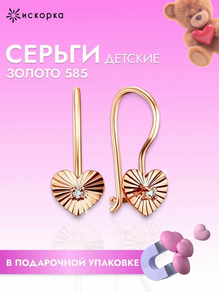 Серьги золотые для девочек 585 пробы будут идеальным решением на каждый день. Изящные сережки сердечки с алмазной гранью создадут особенный акцент в образе маленькой принцессы. Дизайнерские сережки из красного золота 585 высокого качества. Металл не темнеет и не деформируется со временем, обладает высокой прочностью. Модные серьги с фианитами будут смотреться актуально, как на девочках, так и на подростках. Надежный и удобный французский замок позволит комфортно носить серьги каждый день, не давят ушки. Детские сережки очень легко сочетать с любыми другими ювелирными украшениями. В нашем ассортименте широкий выбор различных изделий, которые можно выигрышно сочетать друг с другом. Модный и современный дизайн позволит создать красивый подарочный комплект. Золотые сережки в уши станут роскошным подарком на все случаи жизни, будь то новый год или день рождение. Детские украшения самых разнообразных дизайнов всегда будут ценным подарком для маленьких леди. Украшение бережно упаковано в подарочную упаковку, что делает момент вручения особенно приятным. Вся ювелирная продукция подлинная, имеет заводскую пробу, пломбу, бирку с характеристиками и уникальный идентификационный номер (УИН). Фактический вес золотого украшения может незначительно отличаться от характеристик.