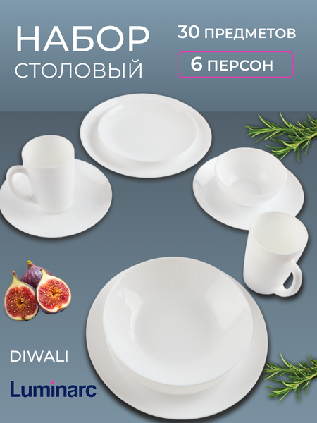 Столовый набор Luminarc DIWALI White 30 предметjd - это идеальное решение для стильной сервировки стола. В набор входят салатники и обеденные, десертные и суповые тарелки, достаточно для 6 персон. Изготовленные из прочной стеклокерамики, тарелки обладают высокой прочностью и долговечностью. Благодаря своему минималистичному дизайну в белом цвете, набор легко сочетается с любым интерьером и другой посудой. Подходит как для повседневного использования, так и для особых случаев. Удобные в использовании и легко моющиеся, эти тарелки станут незаменимым элементом вашей кухни. Приобретая столовый набор Luminarc DIWALI White , вы получаете стильный и функциональный сервиз, в котором есть все необходимое для приема пищи. Этот набор посуды - отличное приобретение для тех, кто ценит комфорт и элегантность в каждой детали. Столовые сервизы бренда Luminarc изготовлены из высококачественного ударопрочного стекла, которое устойчиво к появлению царапин, внешним повреждениям и перепадам температур. Стекло не мутнеет со временем и не выделяет вредных веществ. По сравнению с обычной посудой, оно в 2-3 раза прочнее, и при падении разбивается на крупные неострые куски. В процессе использования стекло не тускнеет и не впитывает запахи. Сервизы украшены яркими красочными принтами, что создает настроение за обеденным столом. Можно мыть в посудомоечной машине и использовать в СВЧ-печи. Большой подарочный набор станет идеальным подарком для любой женщины. Стильная посуда гармонично впишется в кухонный и ресторанный интерьер, станет украшением праздничного стола. Стильные тарелки белоснежного цвета подходят для микроволновой печи, будут активно использоваться дома и на даче. Универсальный набор посуды классической круглой формы станет лучшим решением для приема гостей в домашней обстановке. Столовые приборы гармонично вписываются в современные стили, станут необычным декоративным украшением любого помещения, эффектно дополнят коллекцию праздничной посуды. У нас есть акции и распродажи, вы можете купить наши товары в подарок со скидкой!