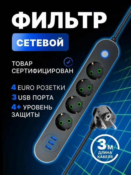 Удлинитель Savlaro - это надежное и удобное решение для подключения электроприборов в любом месте. С его помощью вы сможете подключить несколько устройств одновременно, даже если розетка находится далеко. Удлинитель оснащен 4 розетками и 3 USB-портами, что позволяет подключать к одной розетке больше устройств. Это особенно удобно, если у вас мало розеток или они расположены в неудобном месте. Сетевой фильтр с предохранителем и заземлением обеспечивает защиту подключенных устройств от перепадов напряжения, коротких замыканий и других проблем в электросети. Номинальная сила тока составляет 10 А, максимальная нагрузка - 2500 Вт. Удлинитель имеет компактные размеры (320x60x40 мм) и стильный черный цвет. Длина кабеля составляет 3 метра, что позволяет удобно разместить устройства на расстоянии от розетки. Товар сертифицирован и имеет степень защиты 4+. Обеспечьте себе и своим близким комфортное и безопасное использование электроприборов с удлинителем Savlaro.
