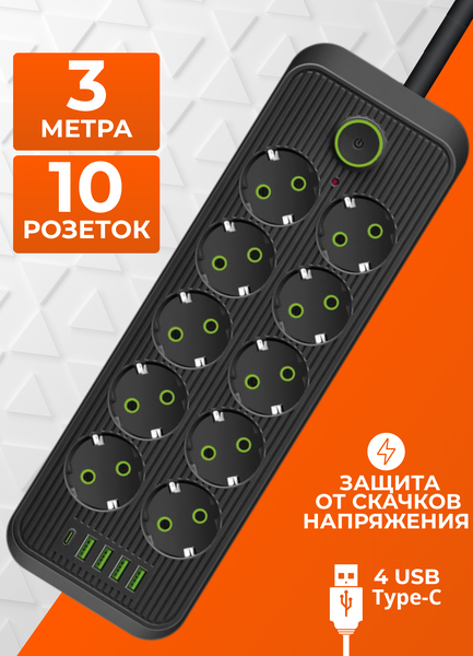 Удлинитель 3 метра, сетевой фильтр 10 розеток, 4 USB порта и type-C портом. Длина шнура пилота - 3 м. -это идеальное устройство для обеспечения безопасности и удобства вашей электроники и приборов для поиска. Этот современный фильтр сочетает в себе множество полезных функций, делая его незаменимым для вашего дома или офиса. Удлинитель сетевой предназначен для бытового использования, для питания ПК, ноутбука, смартфона, бытовых кухонных приборов. Тройник имеет пониженный нагрев, высокий уровень безопасности. Технические характеристики: Номинальный ток сетевого фильтра с предохранителем: 10 А Номинальное напряжение фильтр сетевой: 250 В. Номинальная мощность удлинителя: 2500 Вт USB-порт: 4. Выход USB: 5В 2.1 А (Auto Max) Вход 250В - 50Hz 200мА. Материал корпуса: пластик АВС. Пожаробезопасный корпус: да. Удлинитель usb, тройник с USB удобен для зарядки смартфонов, телефонов и др. электротехники. Удлинитель имеет внешнюю фактуру материала с узором под карбон. Тройник с выключателем имеет возможность выключения питания нажатием на кнопку. Пилот станет отличным помощником дома в быту, квартире, на кухне. спальне, детской комнате, на работе в офисе. при ремонте и строительстве.