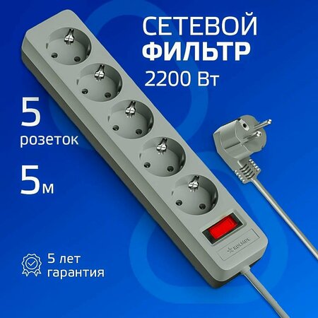 Сетевой фильтр Космос на 5 гнезд, длина провода - 5 м. Белый цвет. Защищает устройства от выхода из строя из-за некачественного тока: защита от перегрузок и замыканий многоразовой автоматикой защита от импульсных помех, часто встречающихся в бытовой электросети Лучше всего подходит для подключения чувствительной электроники: компьютеров, телевизоров, стереосистем и др. Максимальная мощность – 2200Вт, что достаточно для одновременного подключения 2 ноутбуков, телевизора, игровой приставки, и любого мощного устройства 100% медный 3-х жильный кабель с сечением 0,75мм, пожаробезопасный корпус Индикатор сети. Номинальный ток 10А